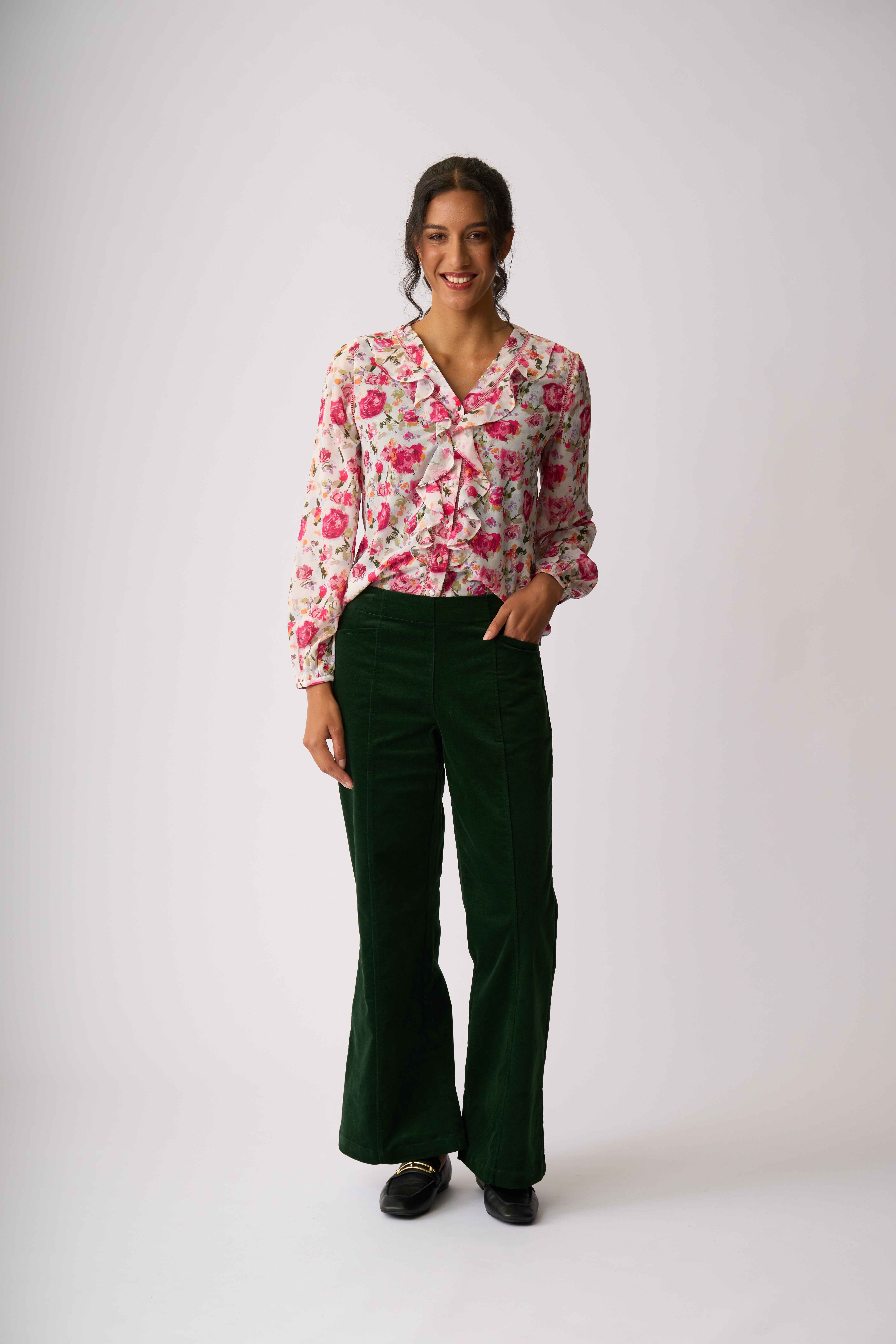 Curved frill details from the shoulder seam, continuing along the front neck, down the button placket  and tapering into the placket.