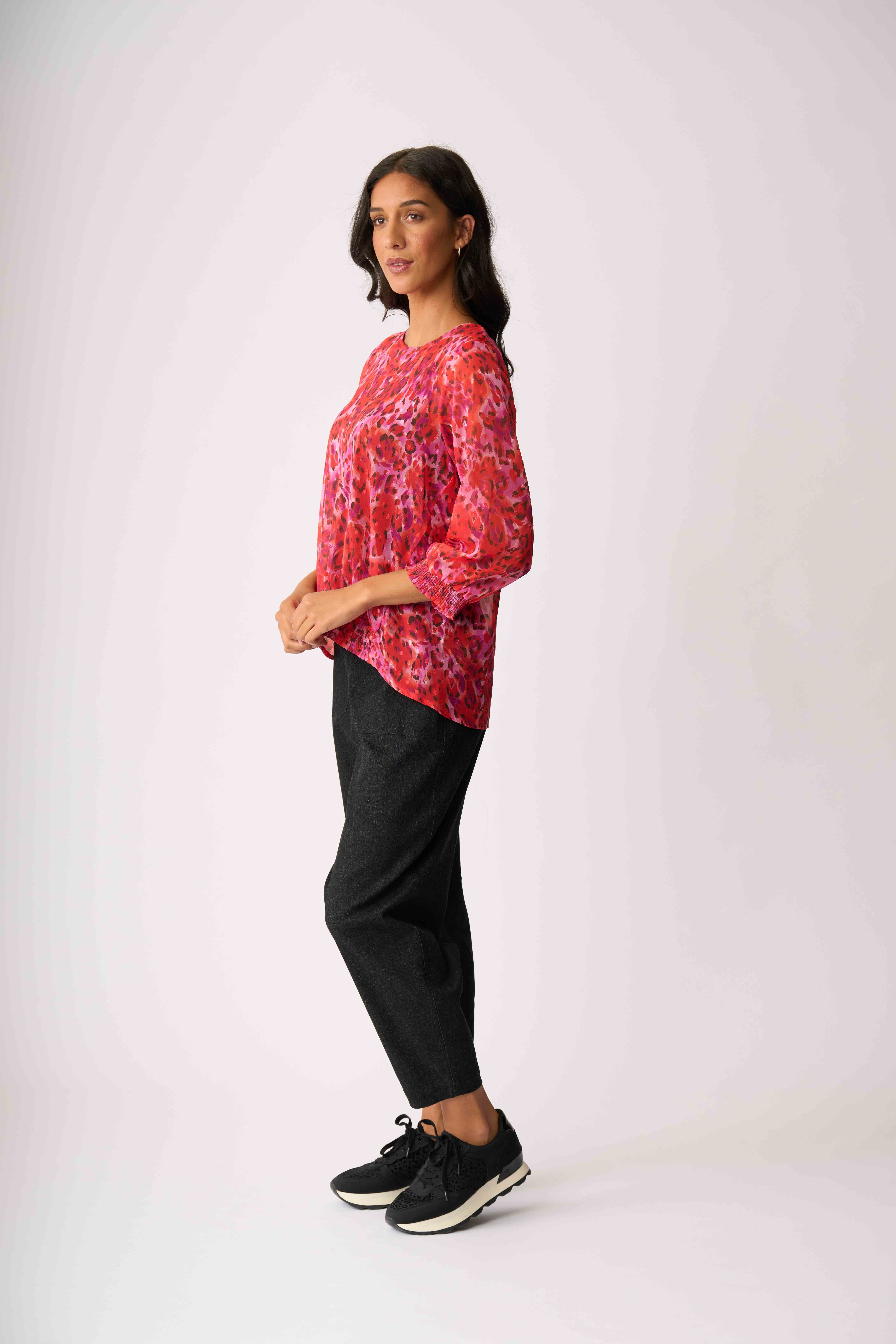 Shirring at the cuffs and a section at the front hem