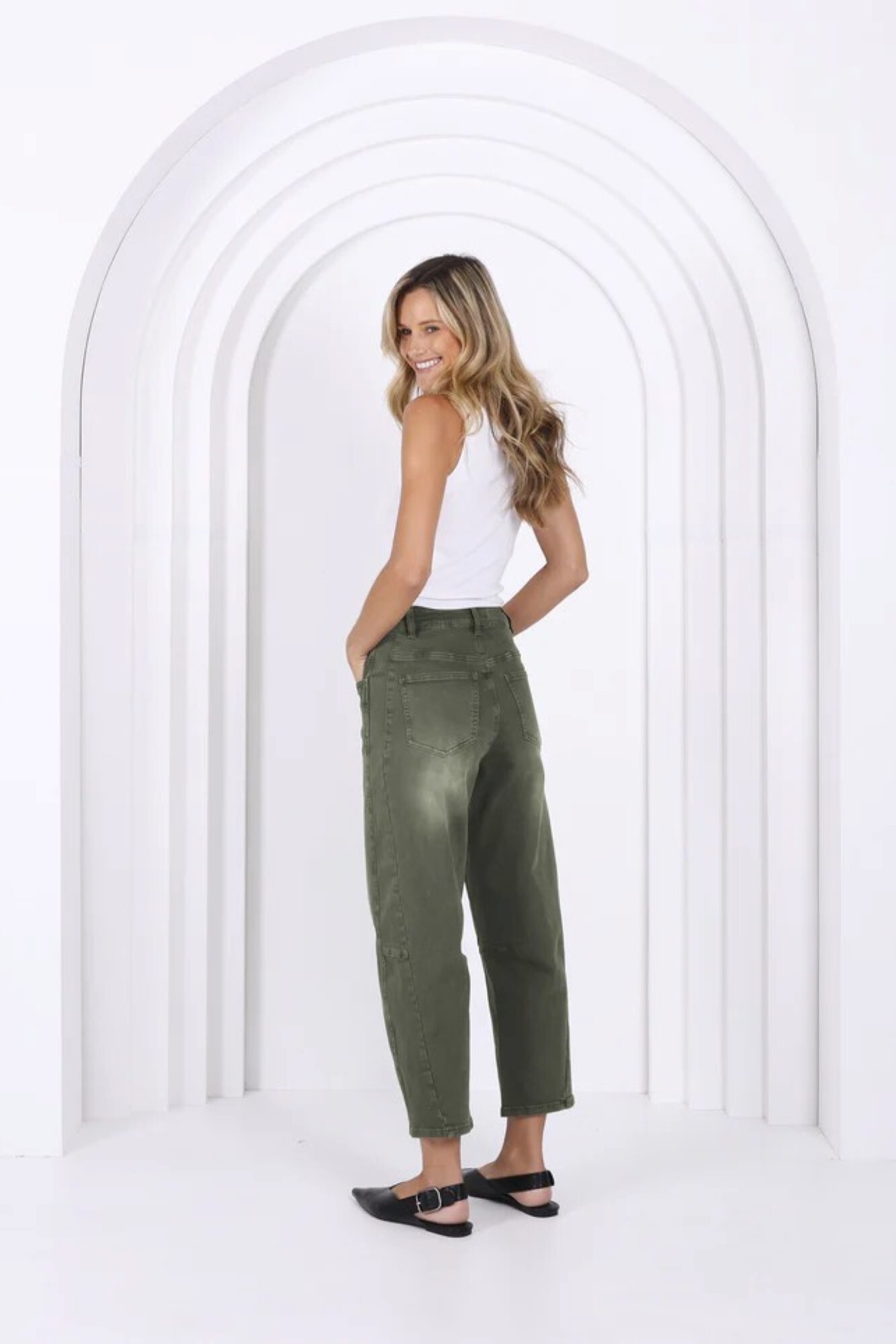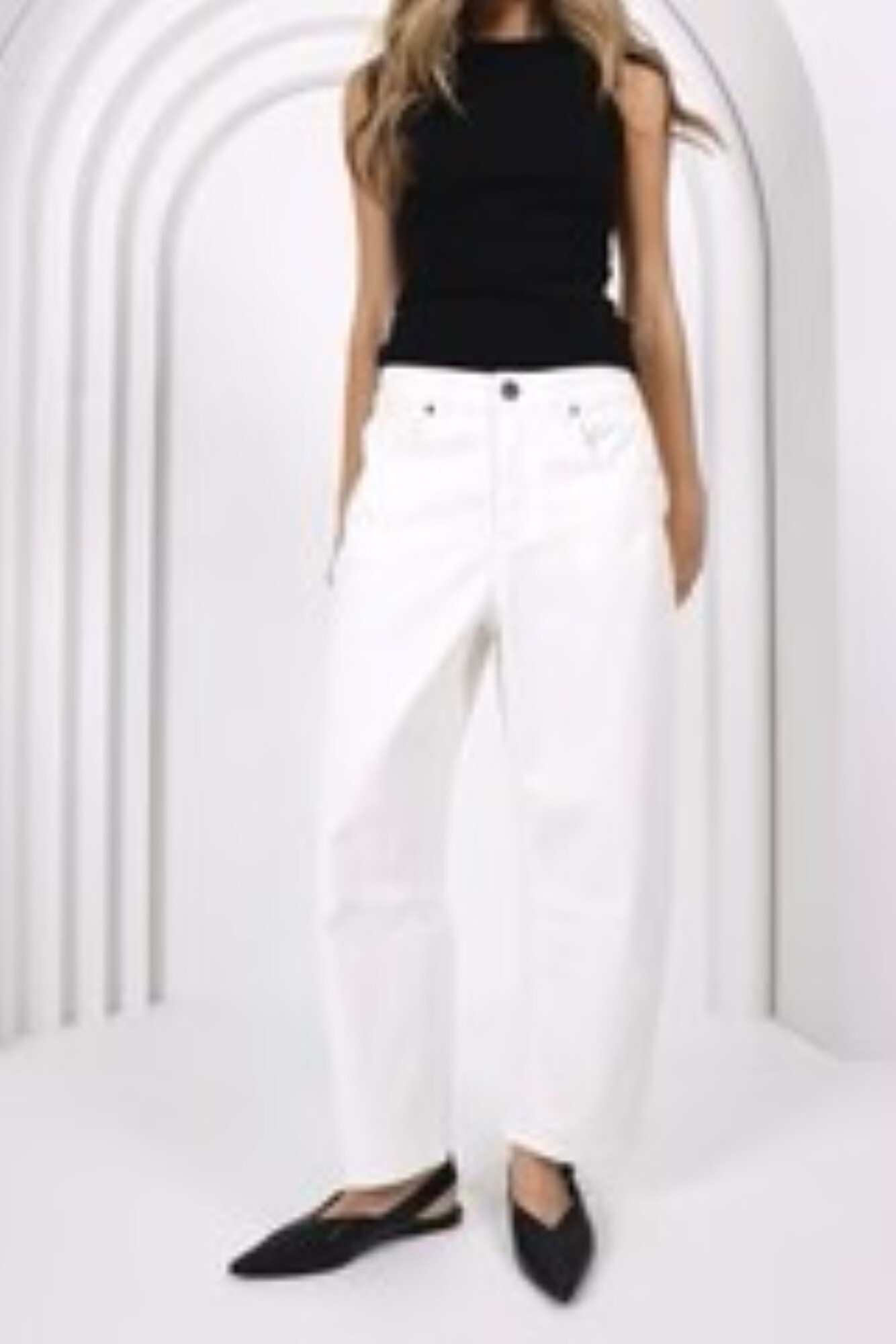 Characteristics of Toni Barrel-Leg Jeans include a fitted waist, flared-out shape around the mid-leg, and tapered silhouette at the bottom, which exudes the look of, well, a barrel. It's the vibe of a cowboy ready for a showdown in the Wild, Wild West!!!