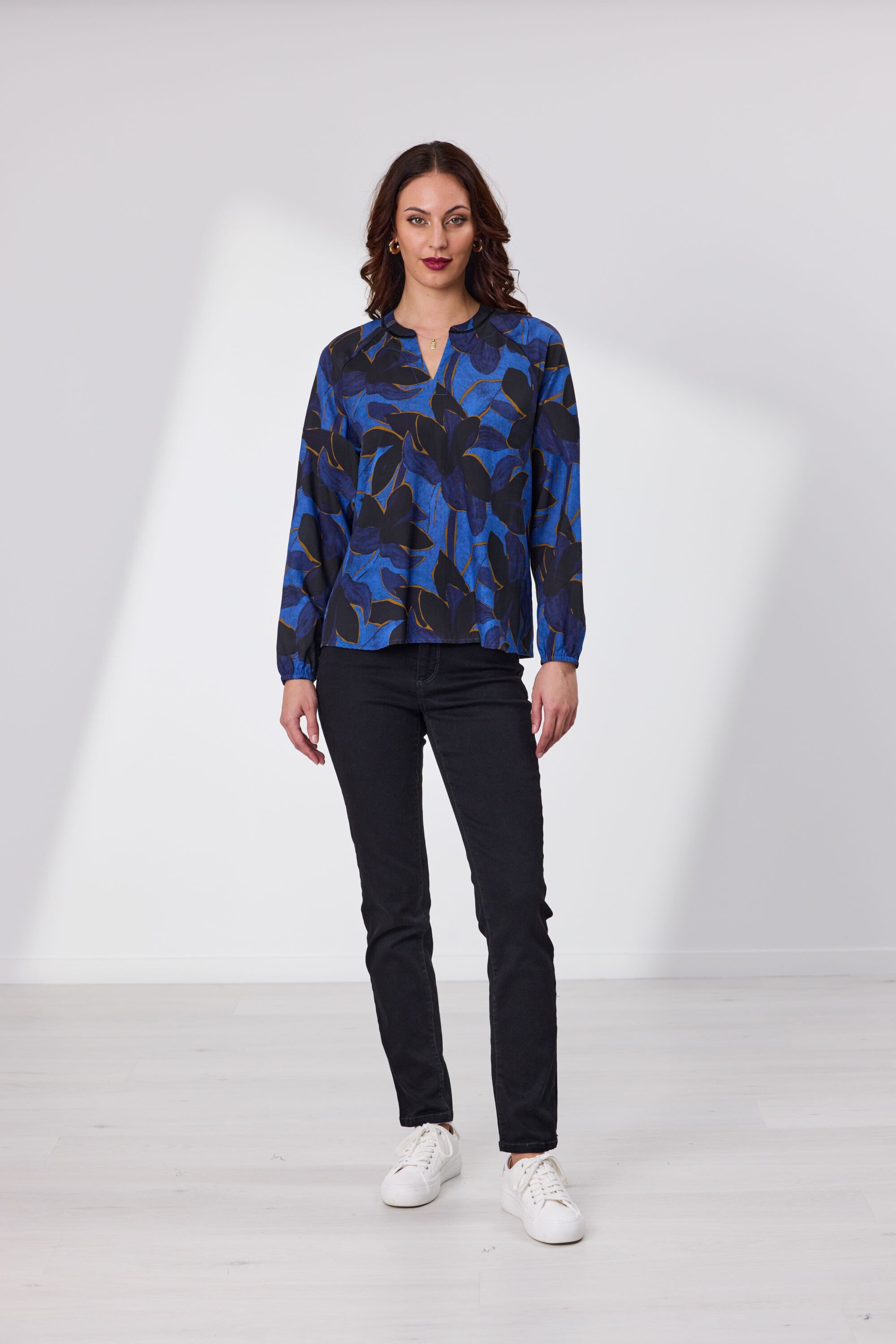 The Azure Print Blouse features a mandarin collar with a notched neckline, accented by a velvet tape trim for a refined finish. Raglan sleeves and elasticated cuffs lend ease and softness to its elegant silhouette.