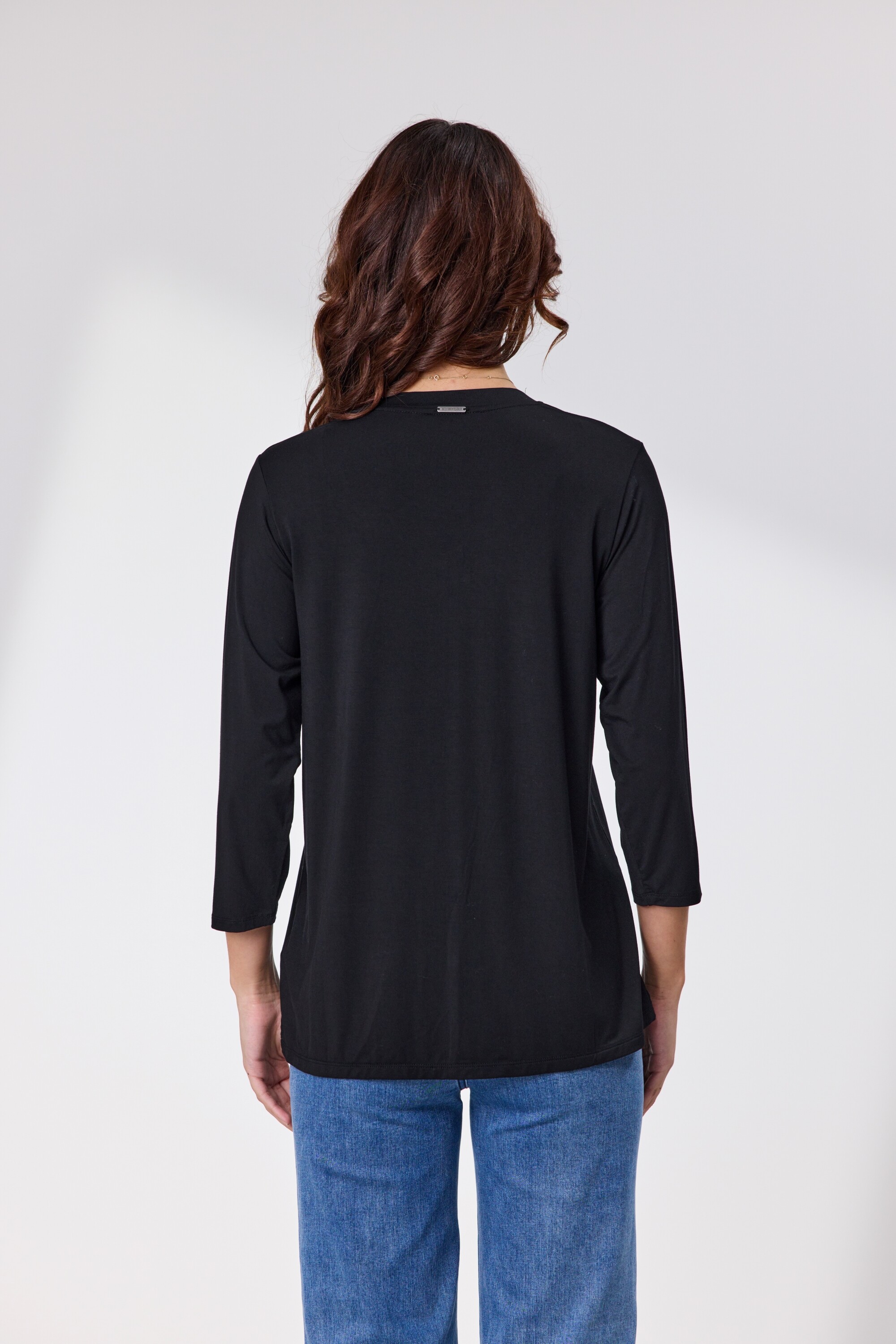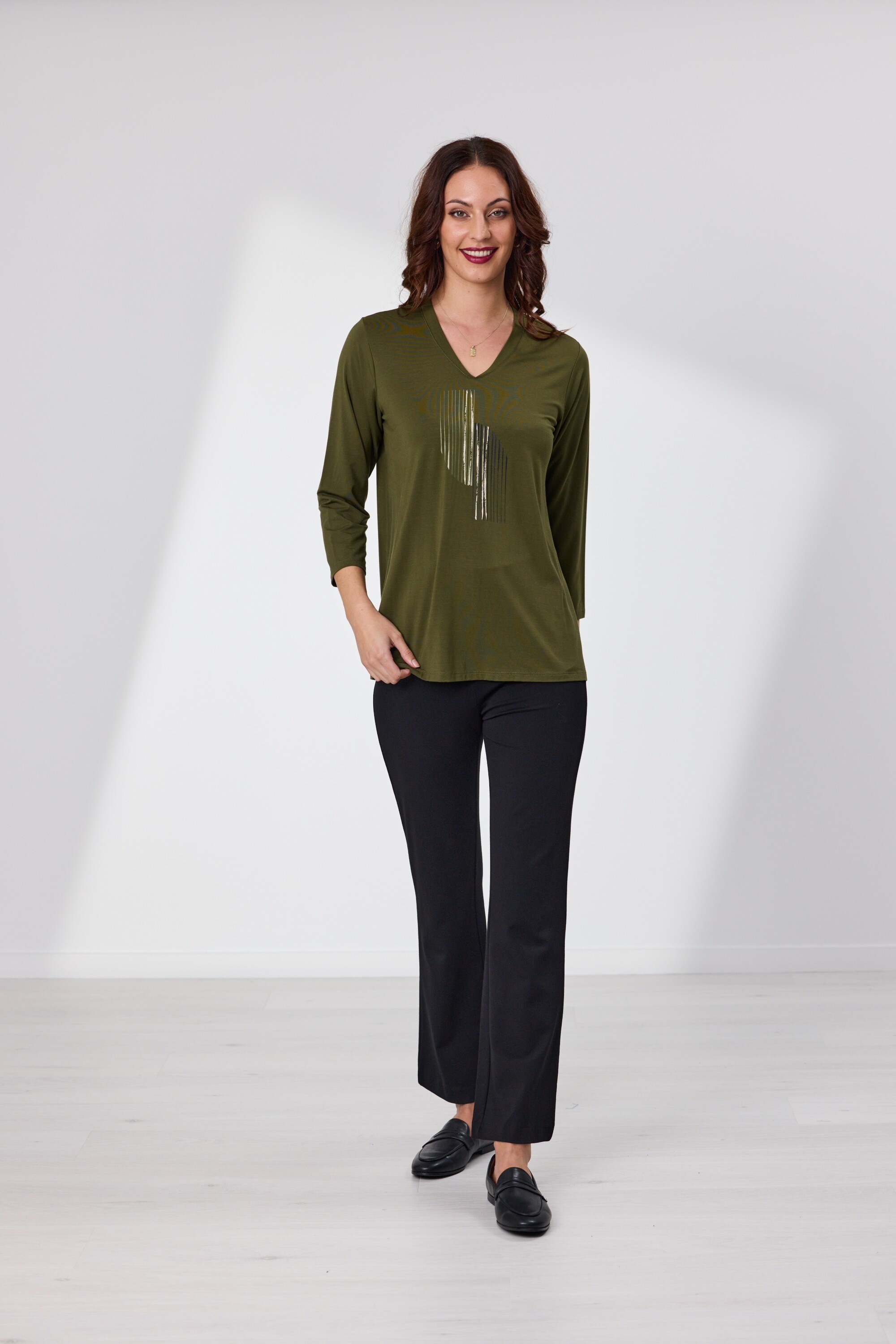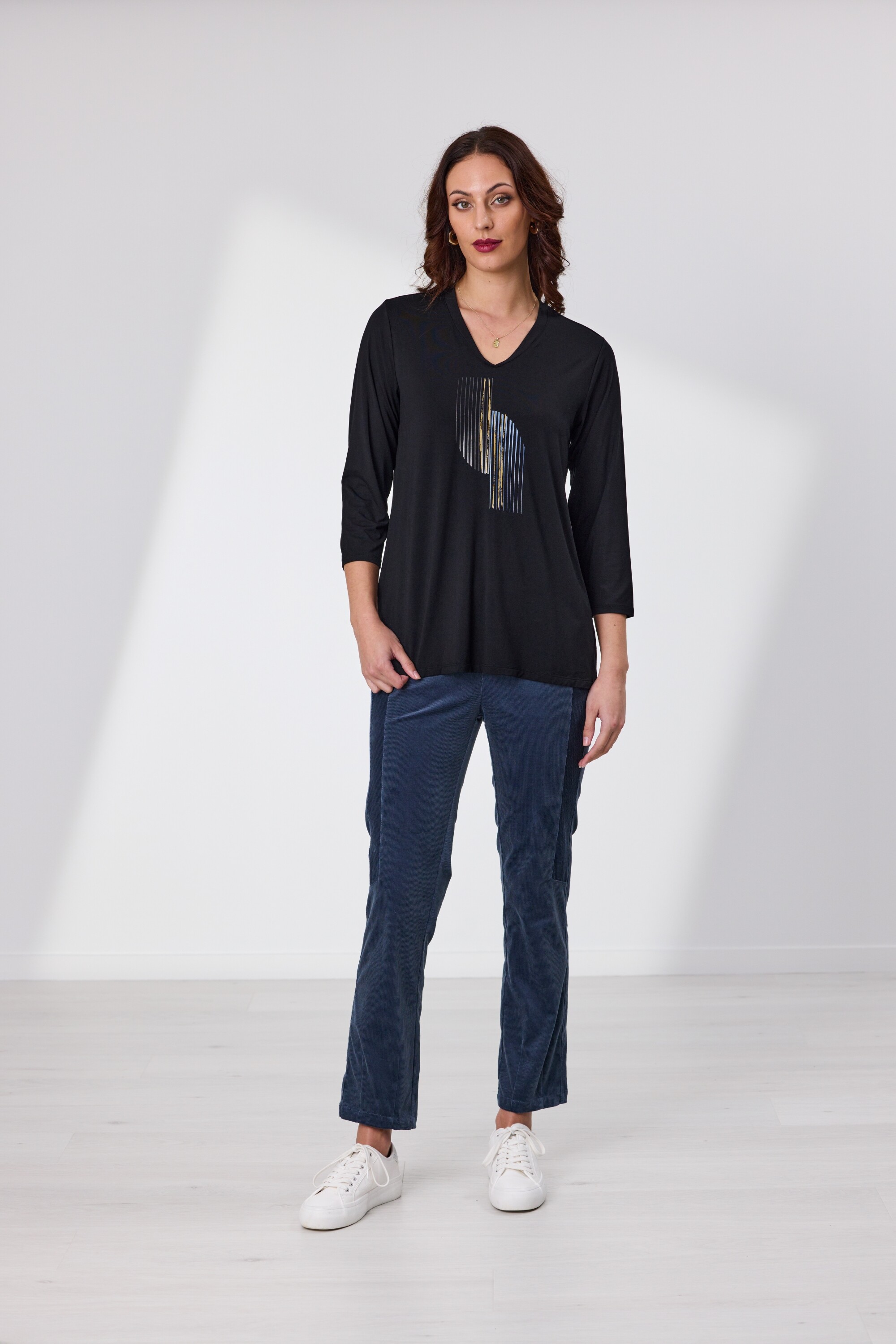Made from a soft drapey Viscose Elastane fabric with three quarter sleeves, shaped V neck & front placement print, the Devon Top is the ultimate in style and comfort.