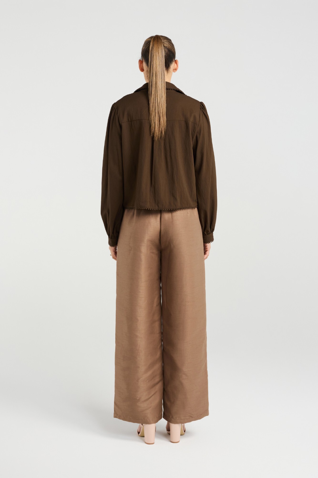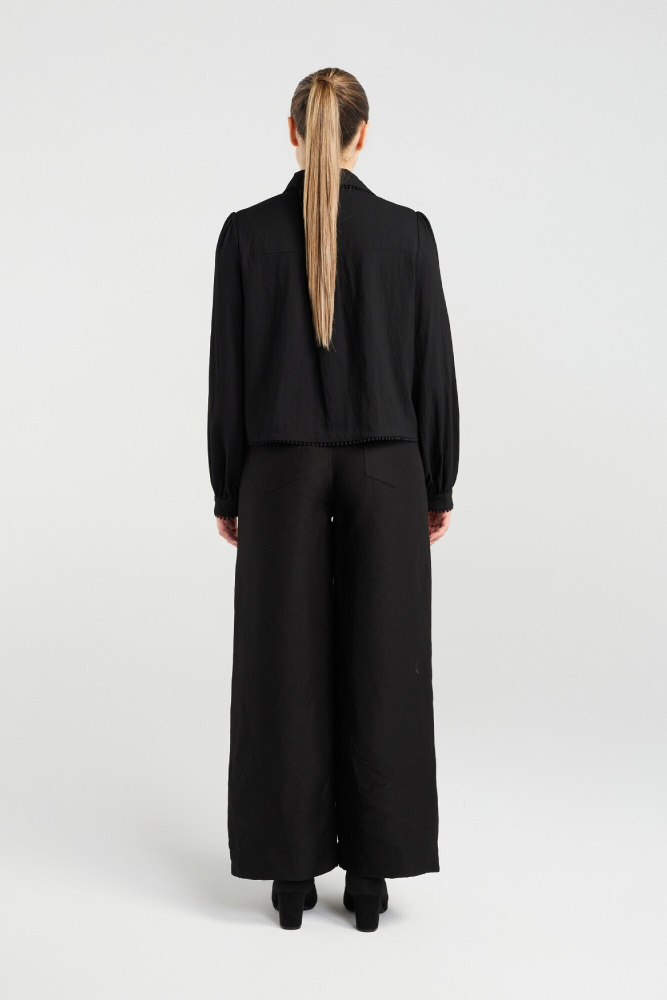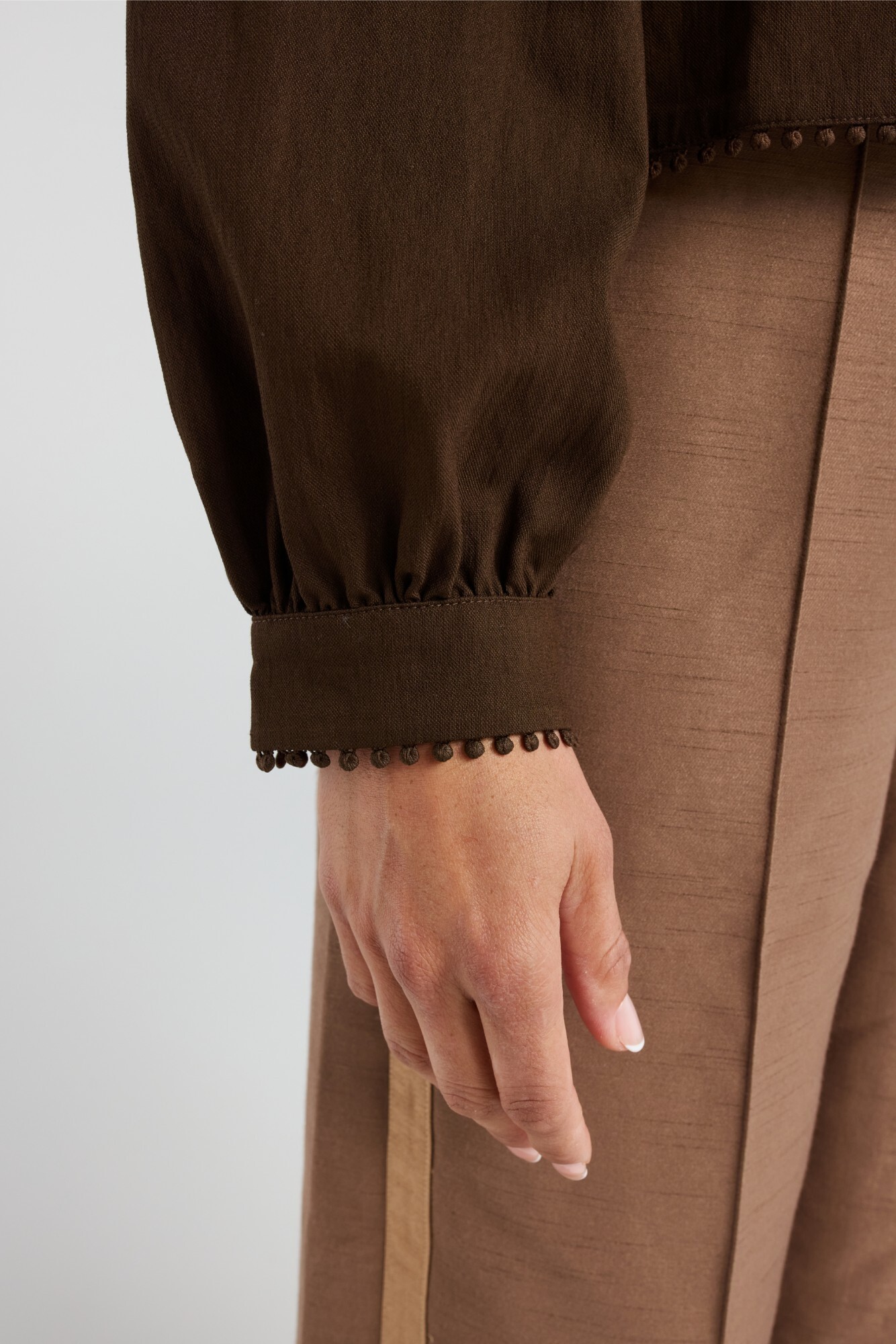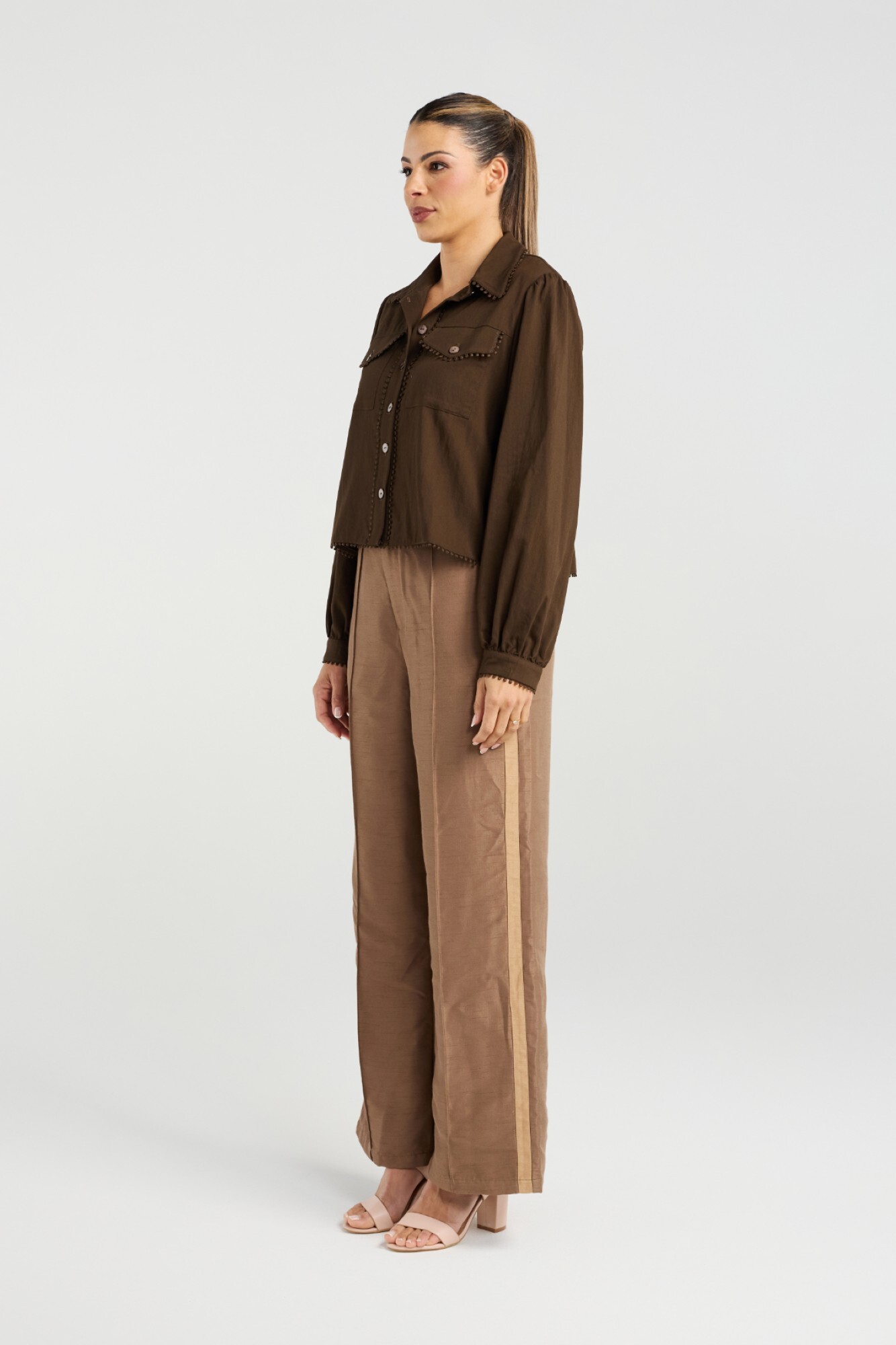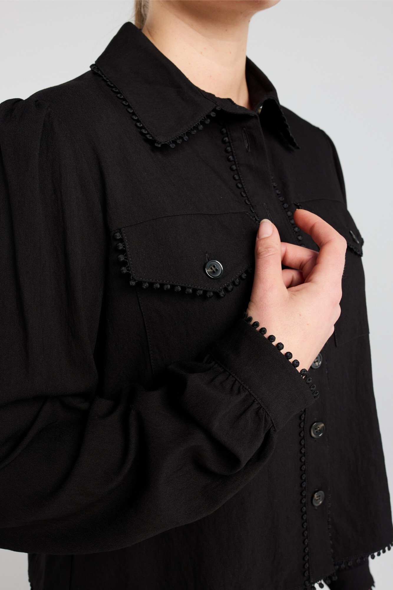 A chic twist on a classic utility style shirt. This shirt features textured pom-pom detailing along the collar, pockets and button placket and hem.