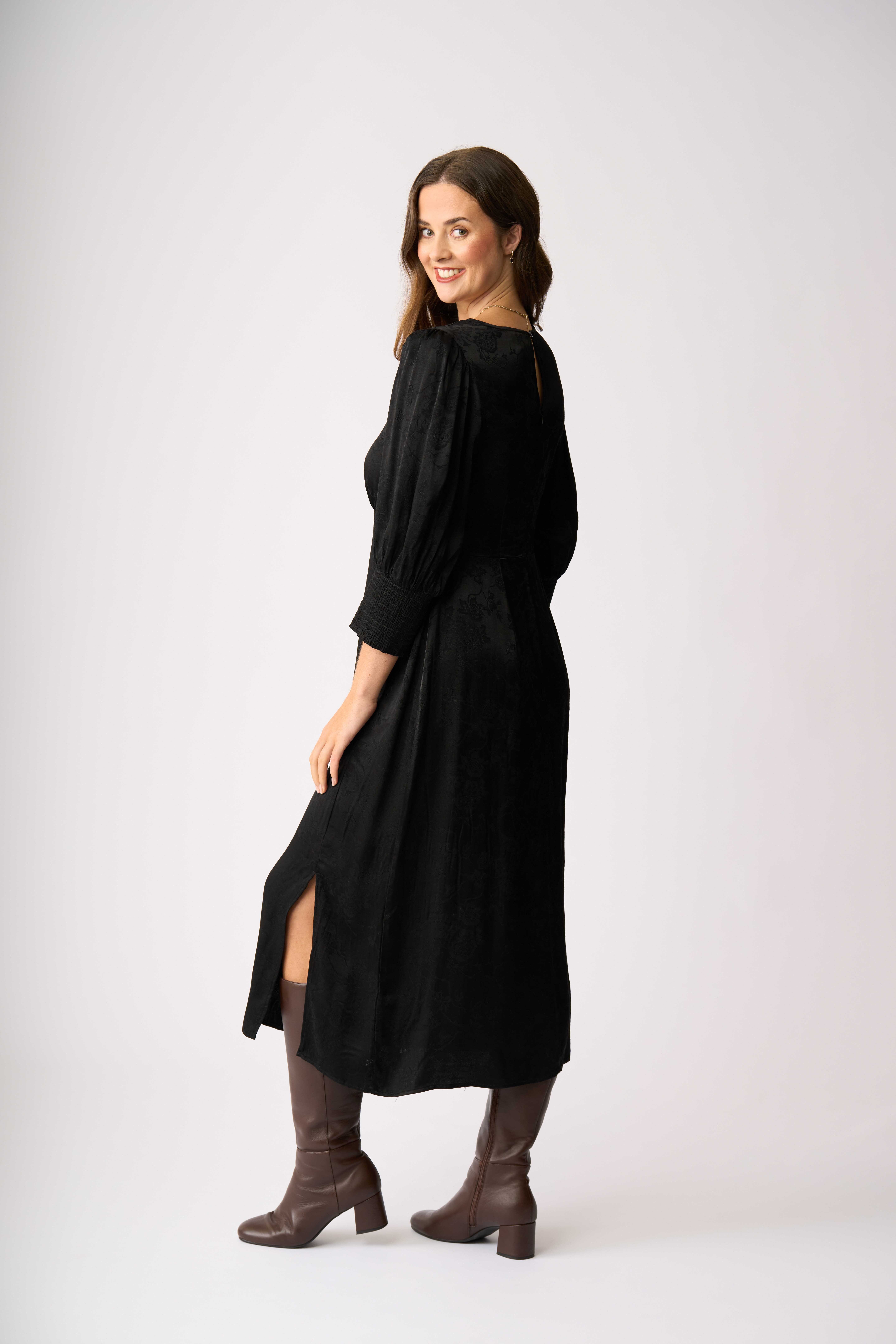 Sleeves feature a double layered cuff with shirring at the back.