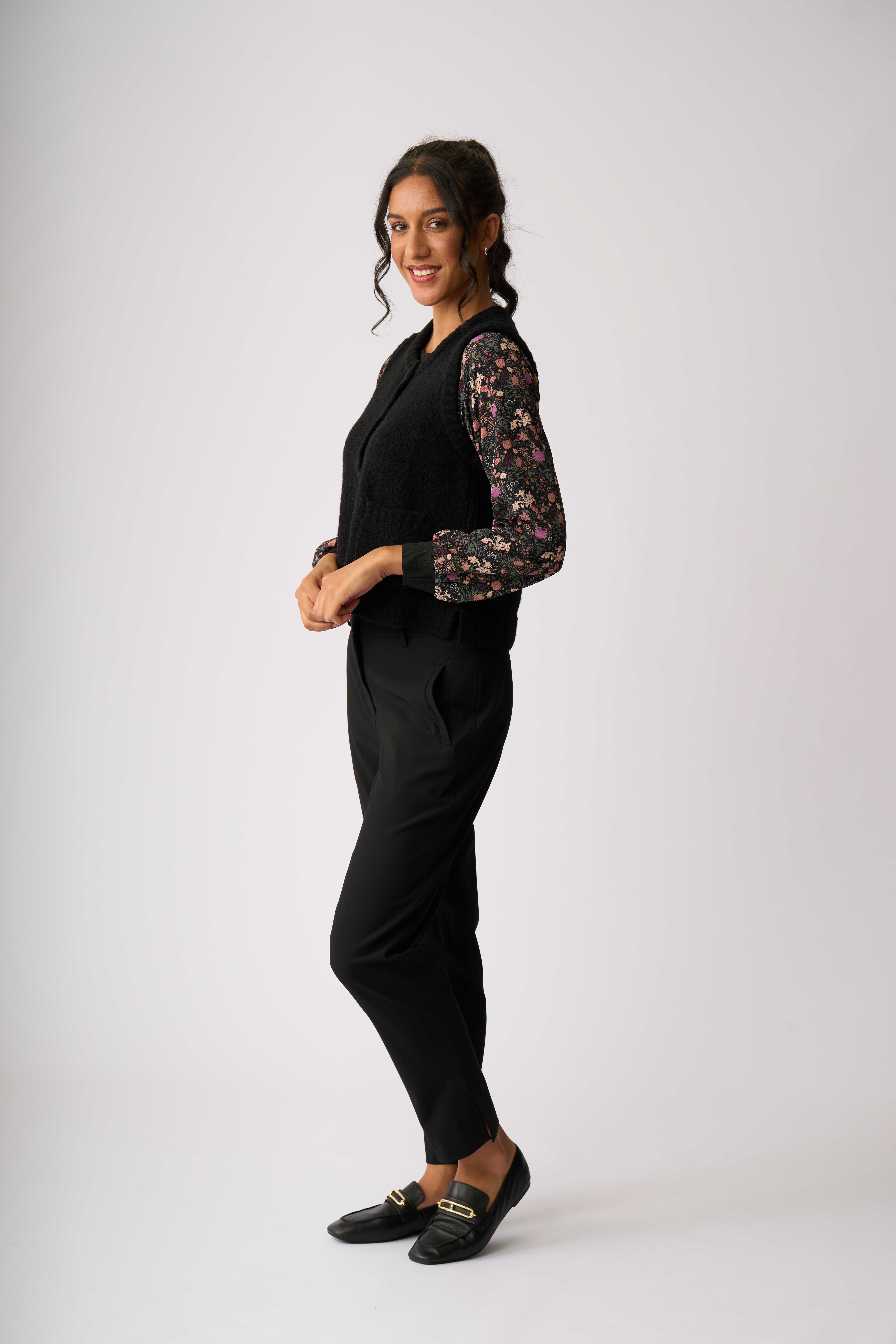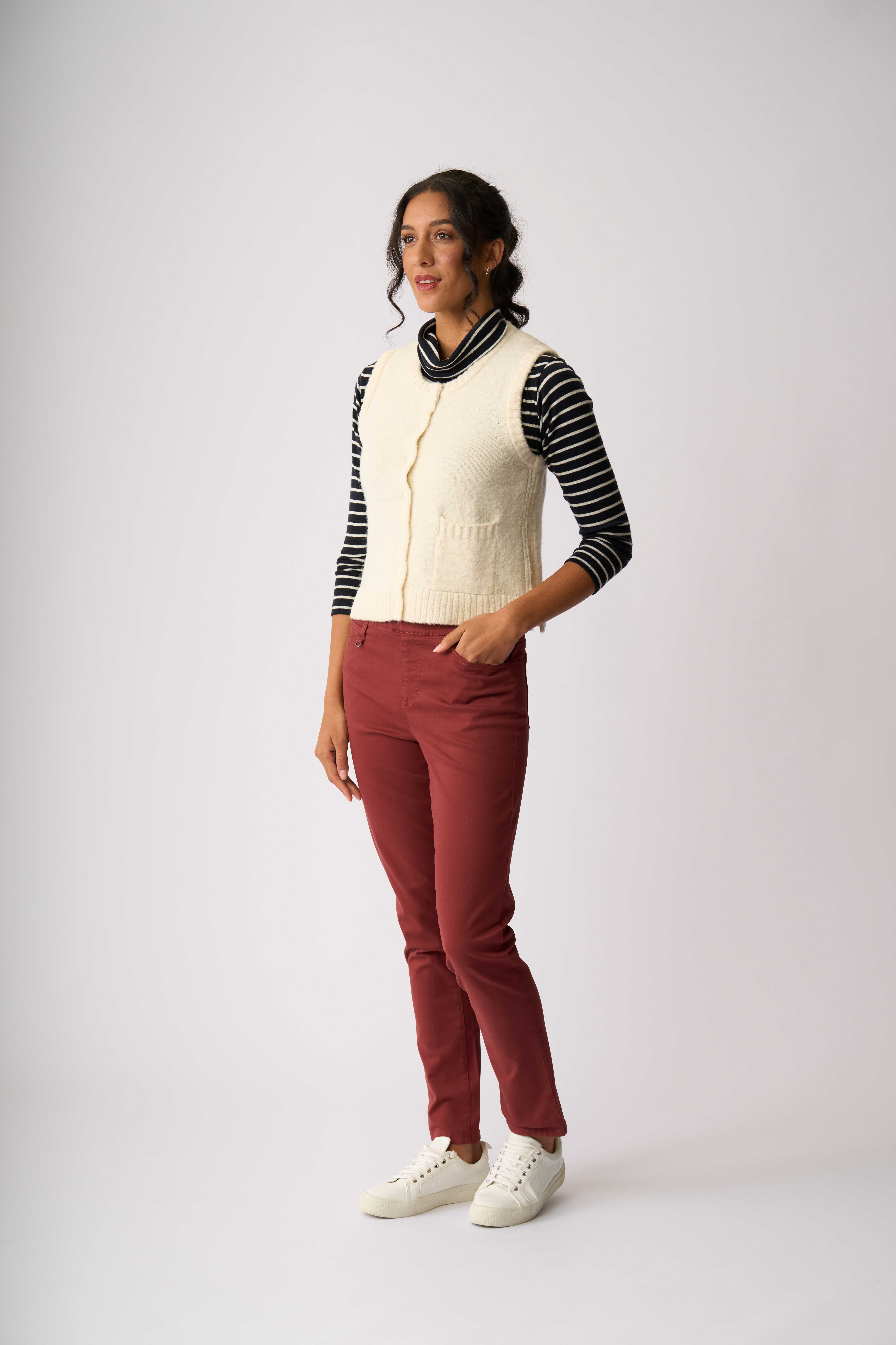Sleeveless vest with rib detailing to the centre back and along the side seams