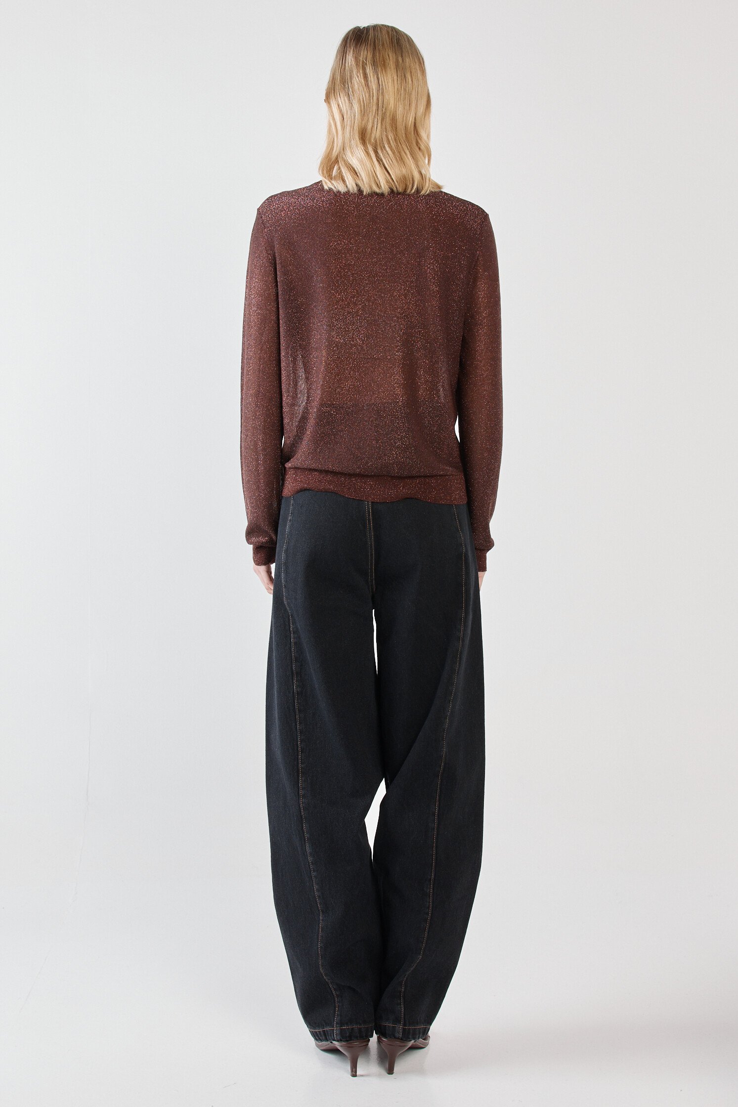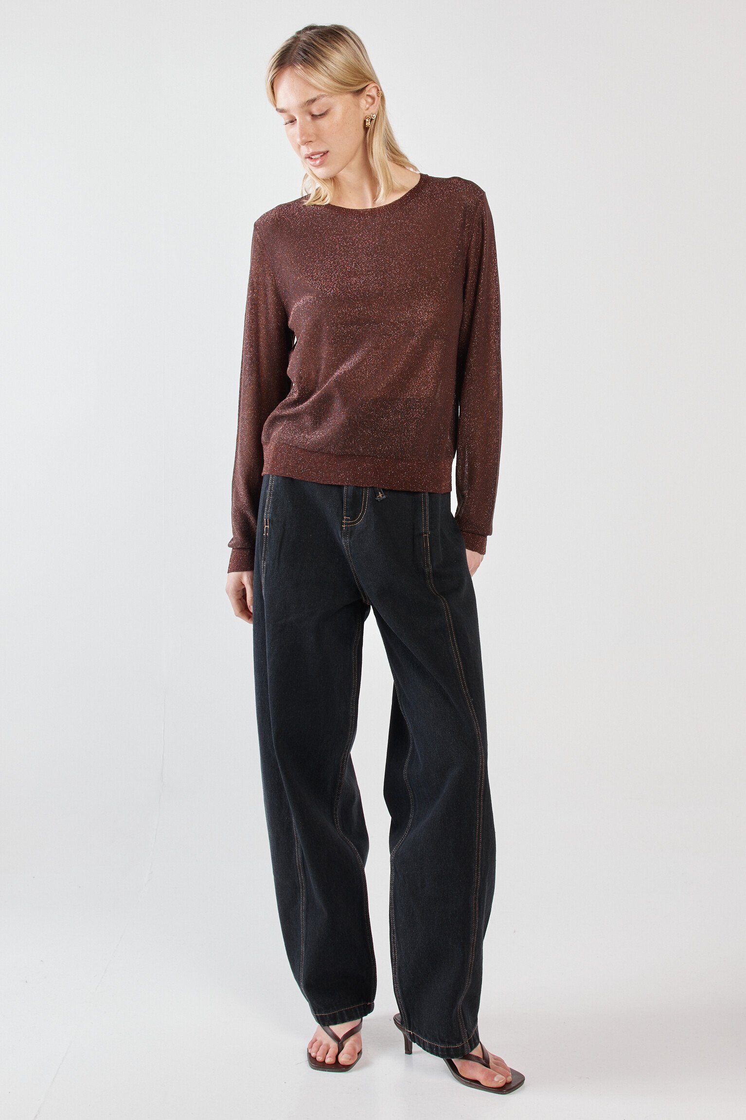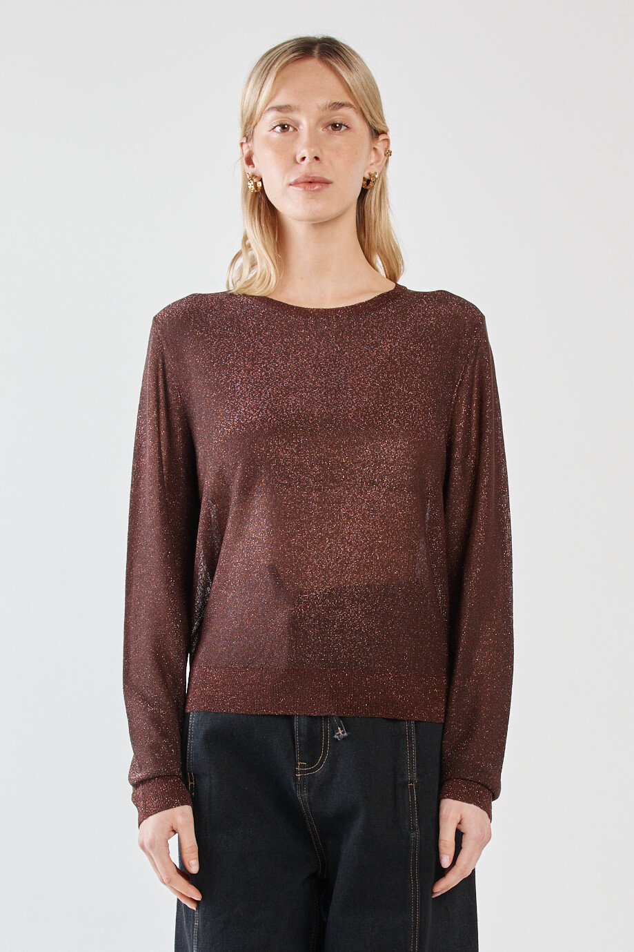 - Sparkly gold lurex knit- Rib detail at hem and on sleeve- Crew neckline- Comfortable wearFabric and Care69% Viscose, 23% Metallic fiber, 8% NylonCold gentle hand wash, do not dry clean