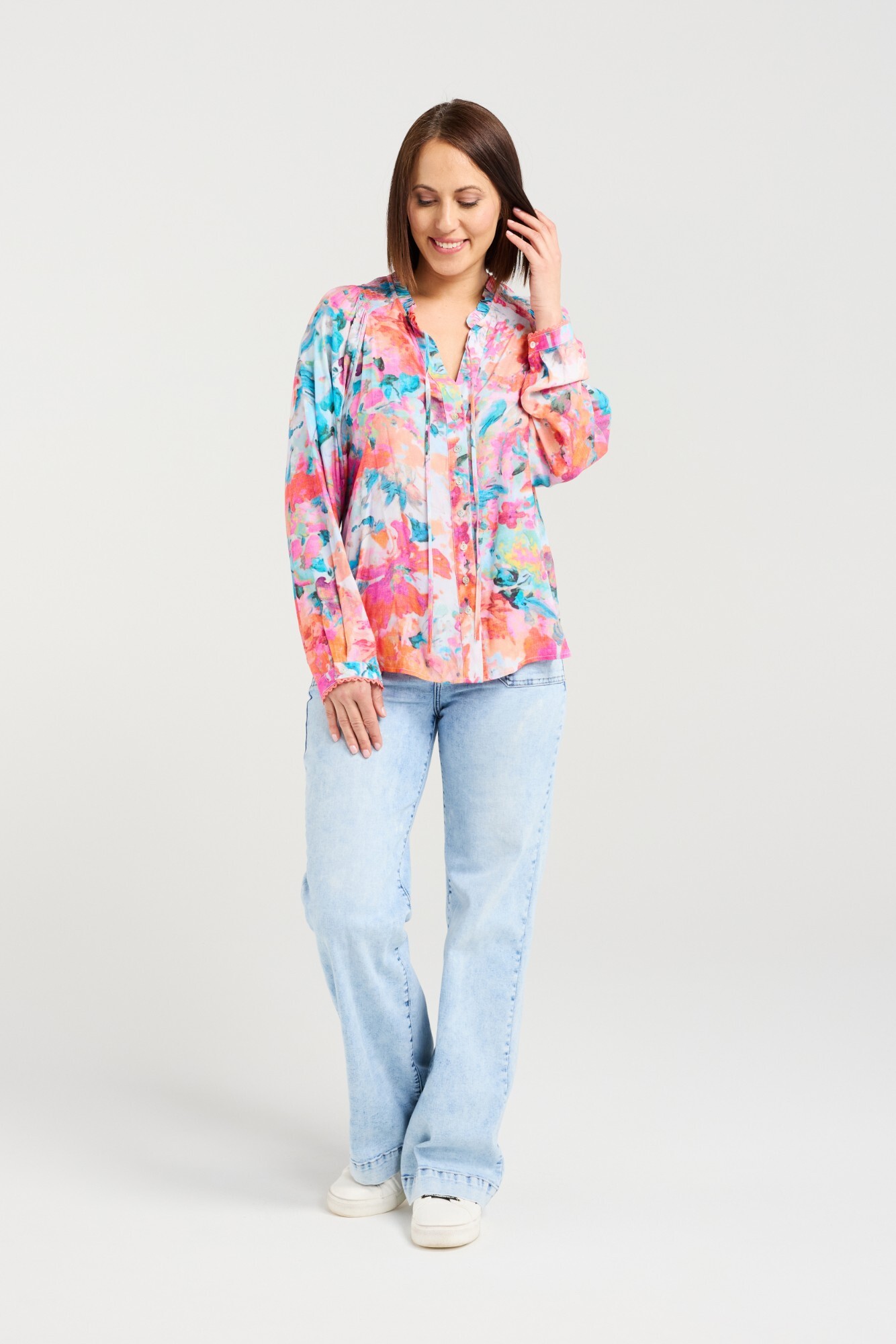 This button-down blouse features a V-neck with a subtle neck trim and delicate ties for a soft, feminine touch. Small trim details around the arm cuffs add refined elegance, making it a versatile piece for polished winter outfits. 50% Viscose 50% Rayon