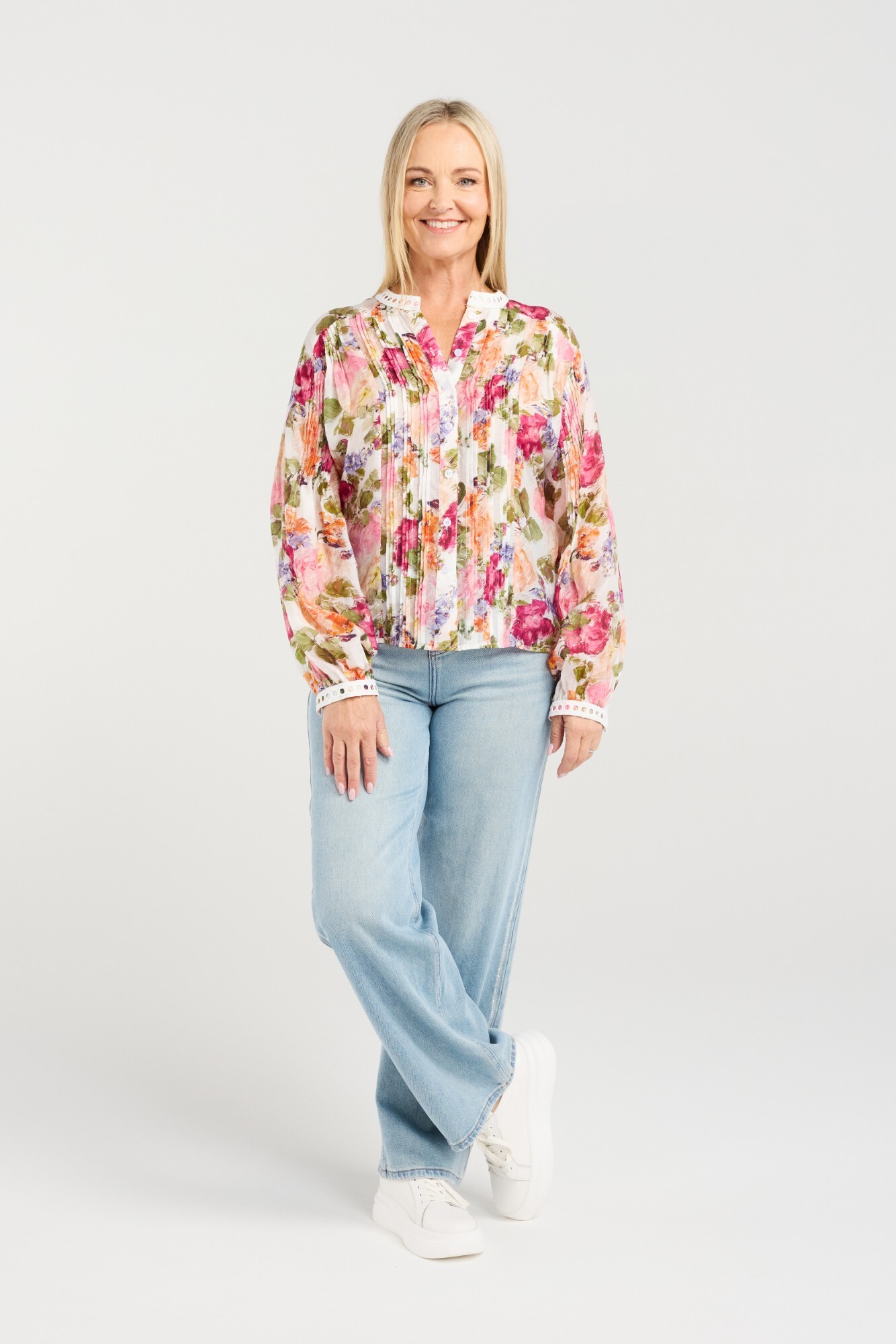 This button-down shirt features pleated details on the bodice and sleeves, complemented by delicate trim around the arm cuffs and neckline. Crafted in a soft, beautiful floral fabric, it offers a feminine and elegant take on a classic silhouette.