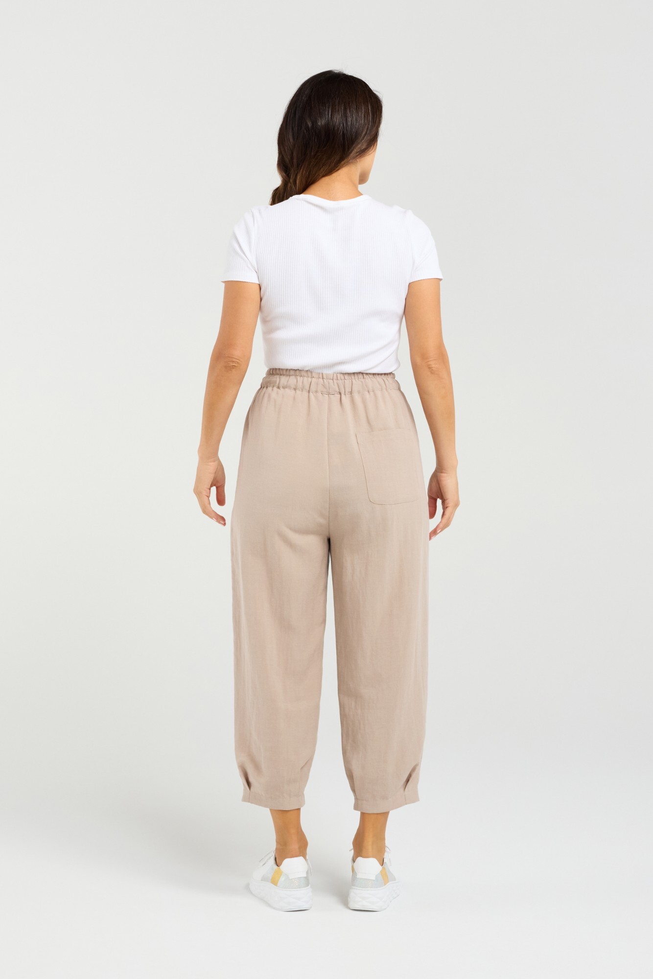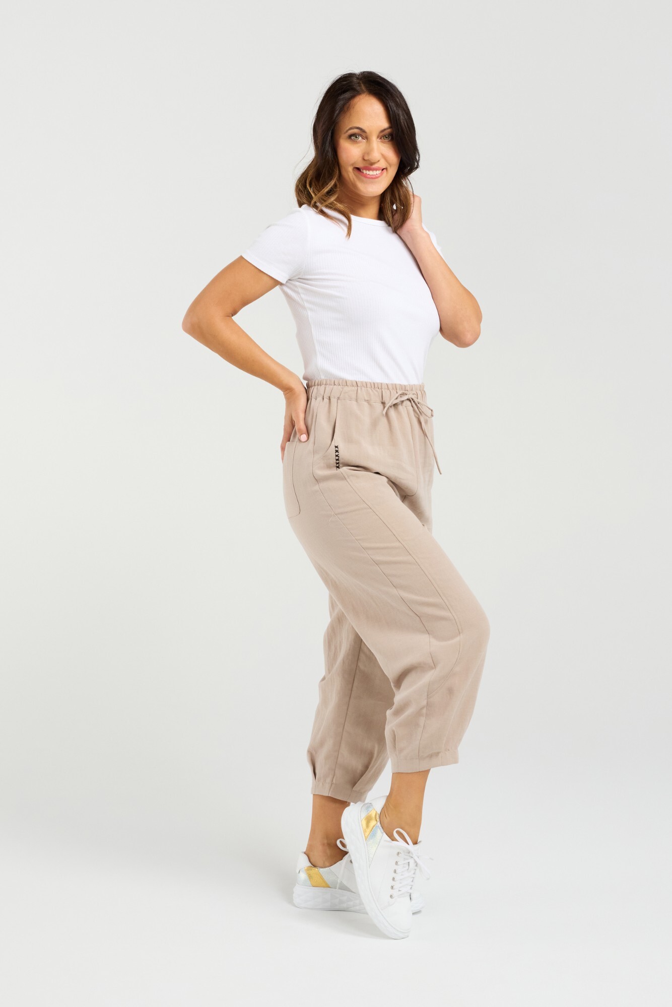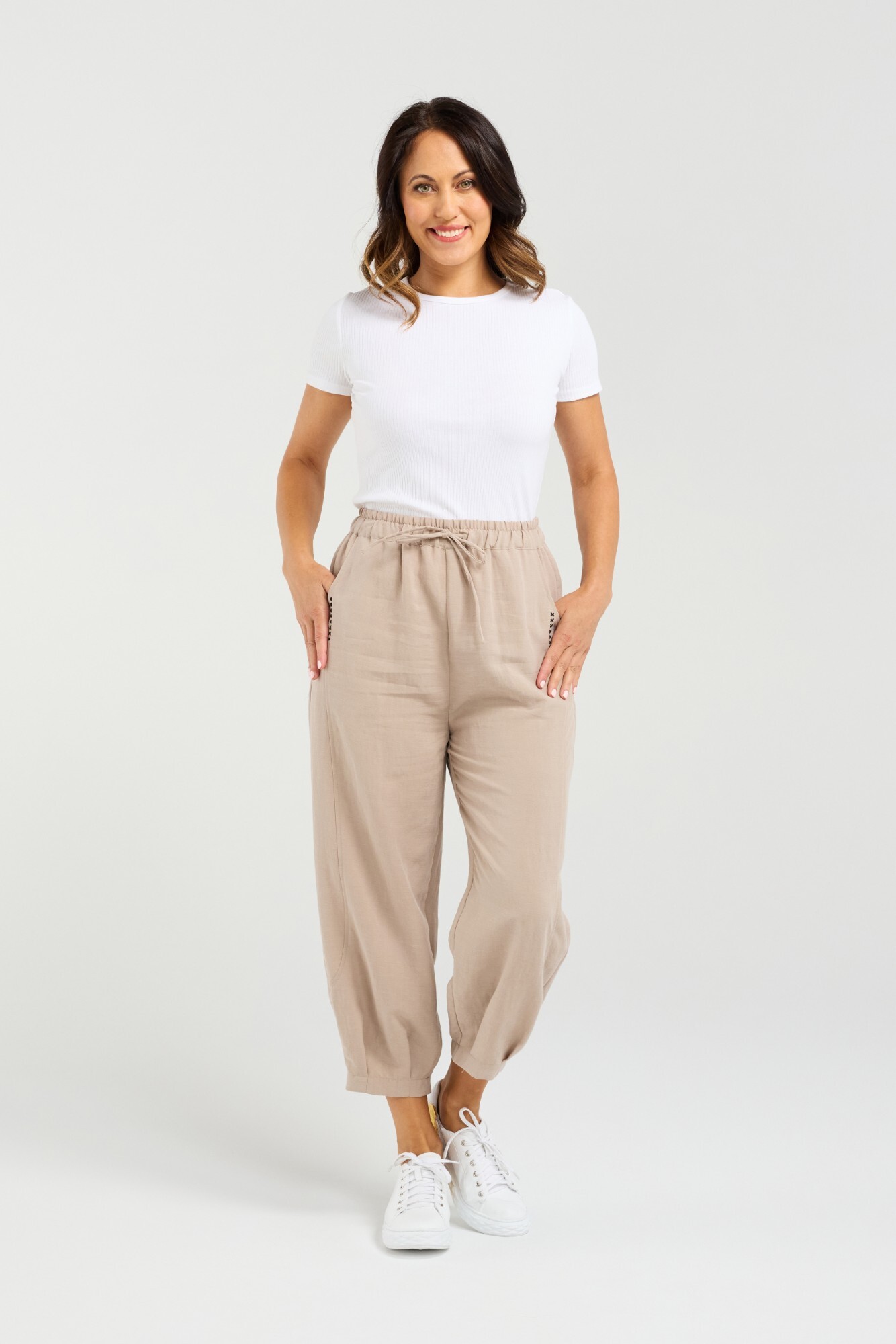 These stylish 7/8 length pants offers comfort. Featuring an elasticated waistband with a drawstring tie, they offer a customizable fit while maintaining a relaxed silhouette. Cross-stitched detailing beside the pockets adds a handcrafted touch, giving the design subtle visual interest. The cuffs are finished with gentle pleating, creating a tapered effect that enhances the ankle-length cut. Ideal for everyday wear.