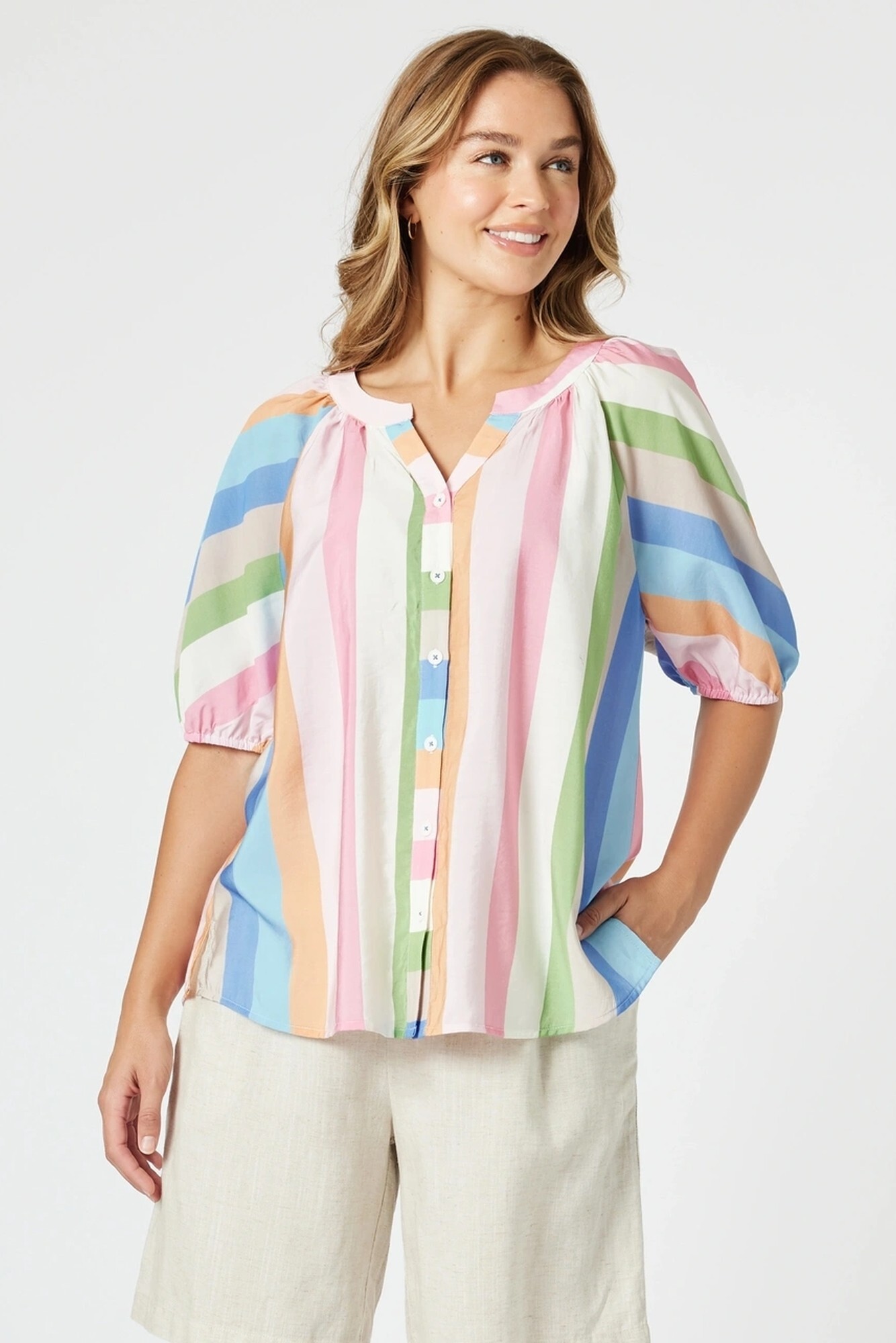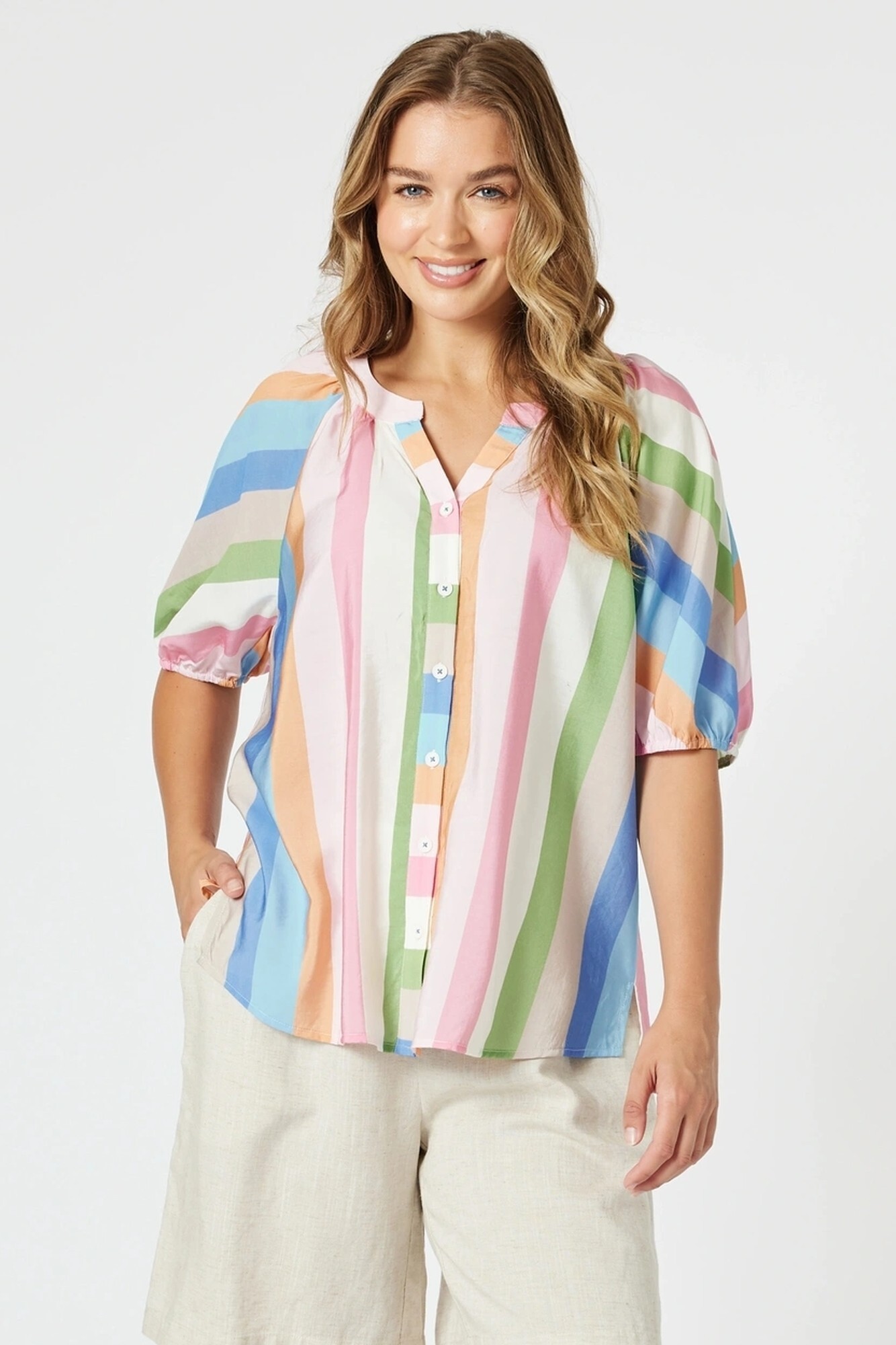 • Designed with a notch neckline, button-through front, and short puff sleeves with elasticated cuffs, it’s the perfect piece for adding a playful pop of colour to your warm-weather wardrobe.