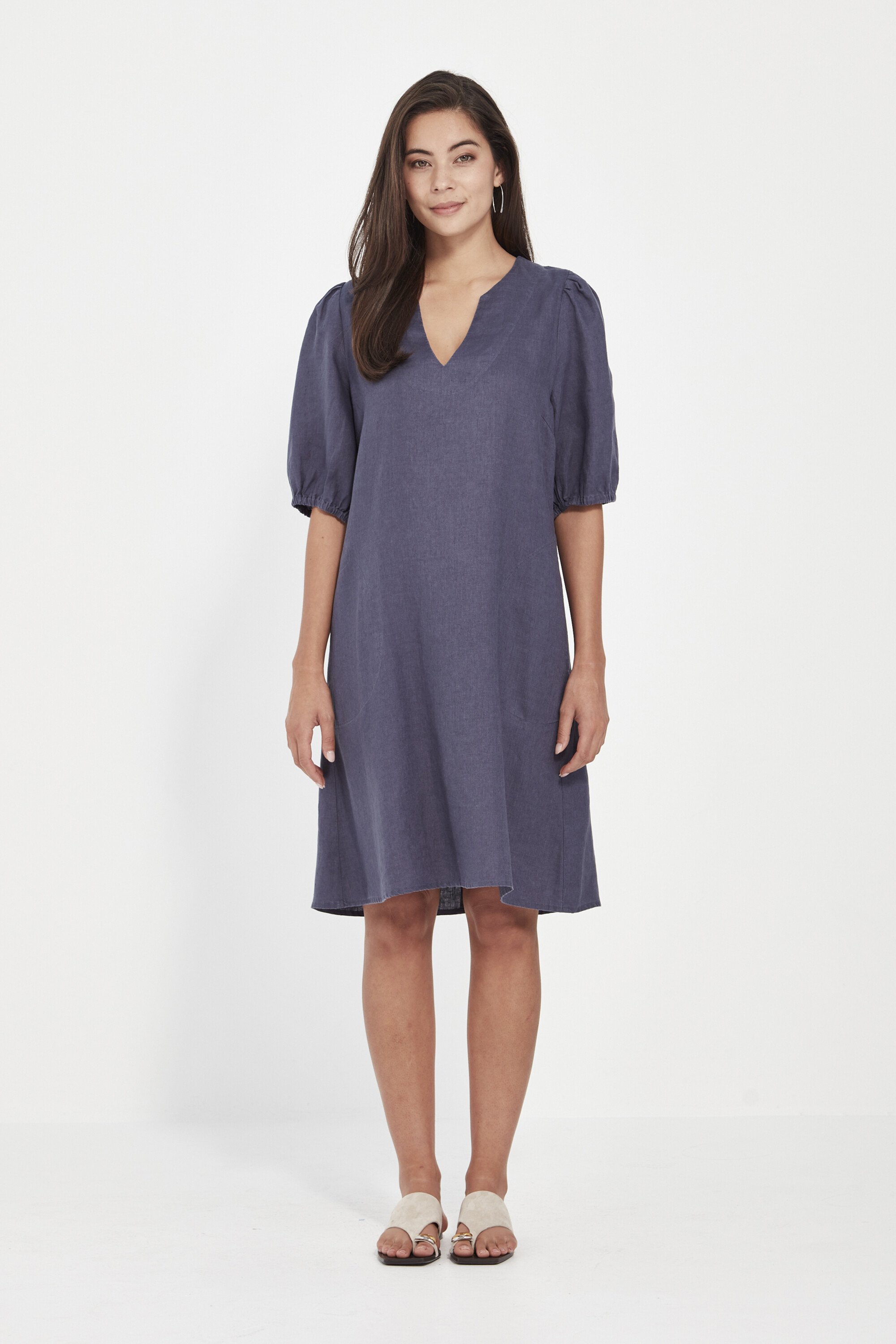 The Becky Dress is a breezy shift silhouette crafted in 100% linen—lightweight, breathable, and perfect for warmer days. Falling to just above the knee, it features a flattering scoop V-neckline and voluminous elbow-length sleeves with elasticated cuffs for a soft, gathered finish. Stitched side pockets add practical charm, while the easy fit and clean lines make it a timeless piece you'll reach for again and again. 100% Linen
