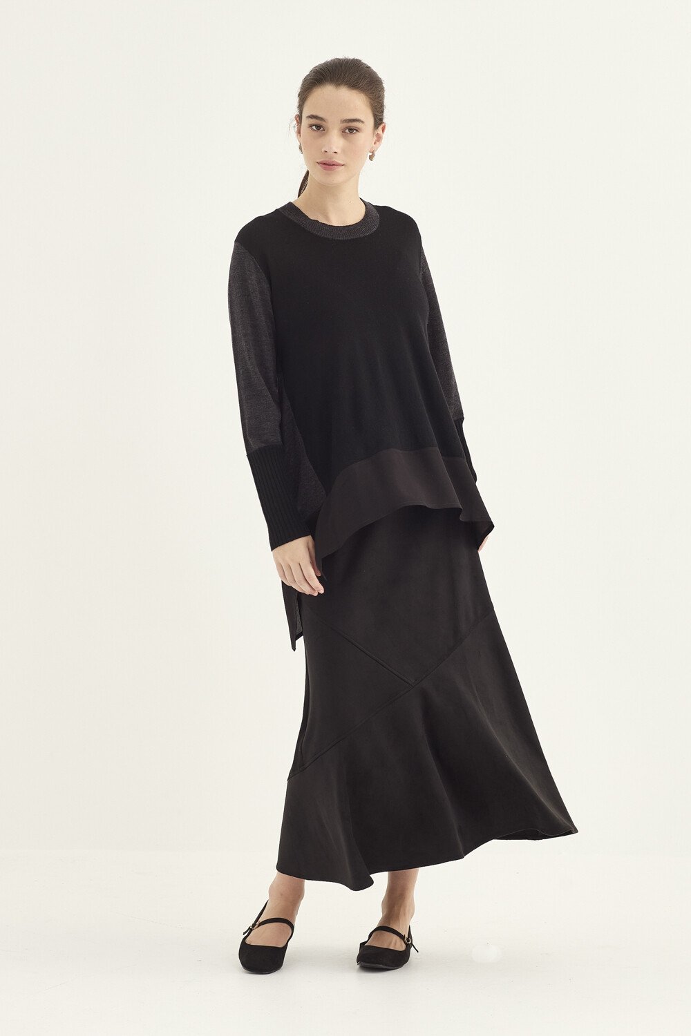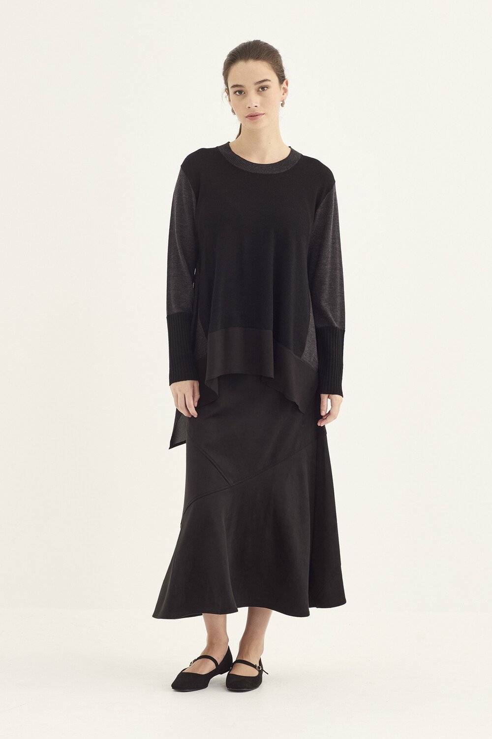 - Crew neckline- Three-colour design- Asymmetrical hem with contrast fabric- Curved side panel- Oversized silhouette- Falls under the hip