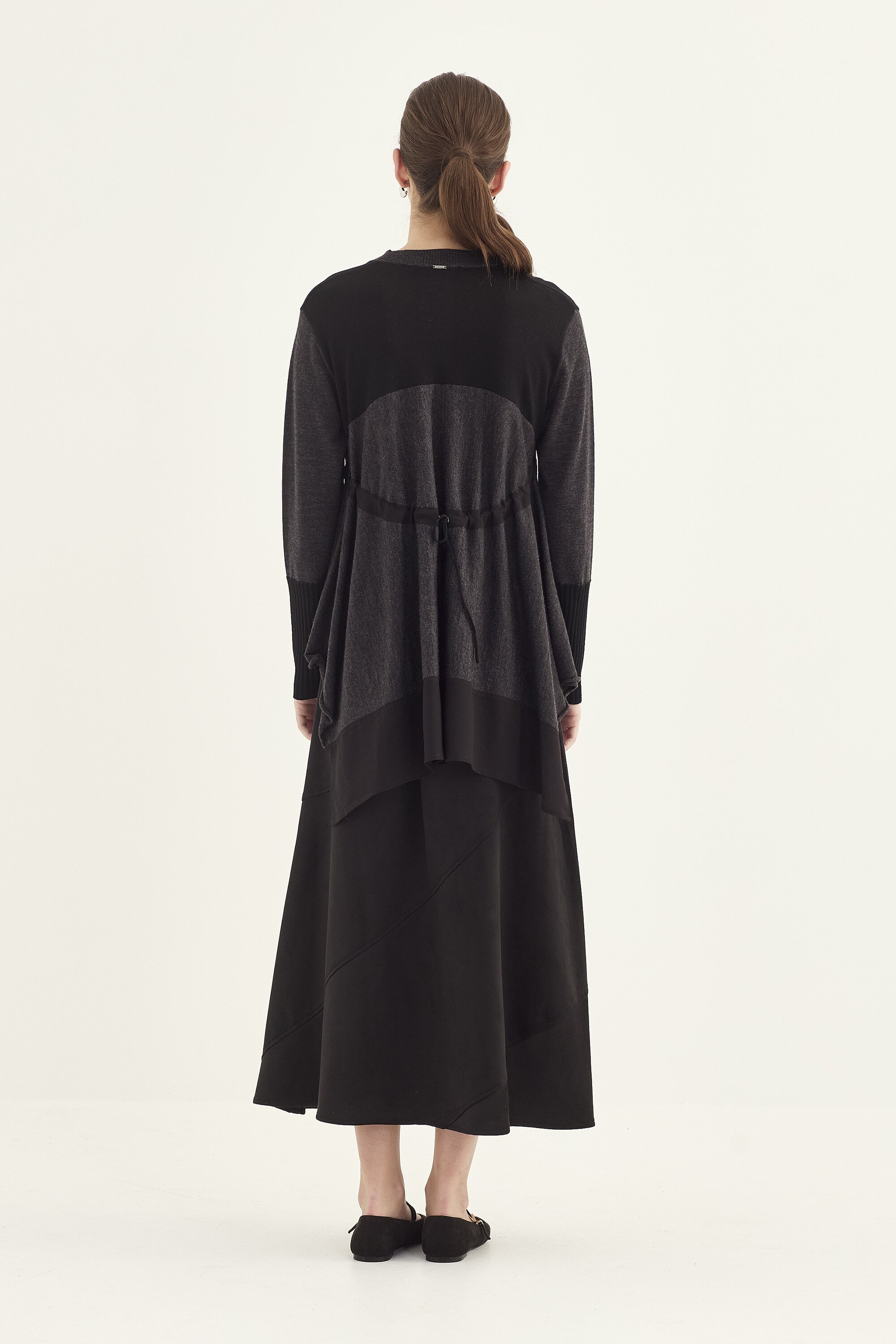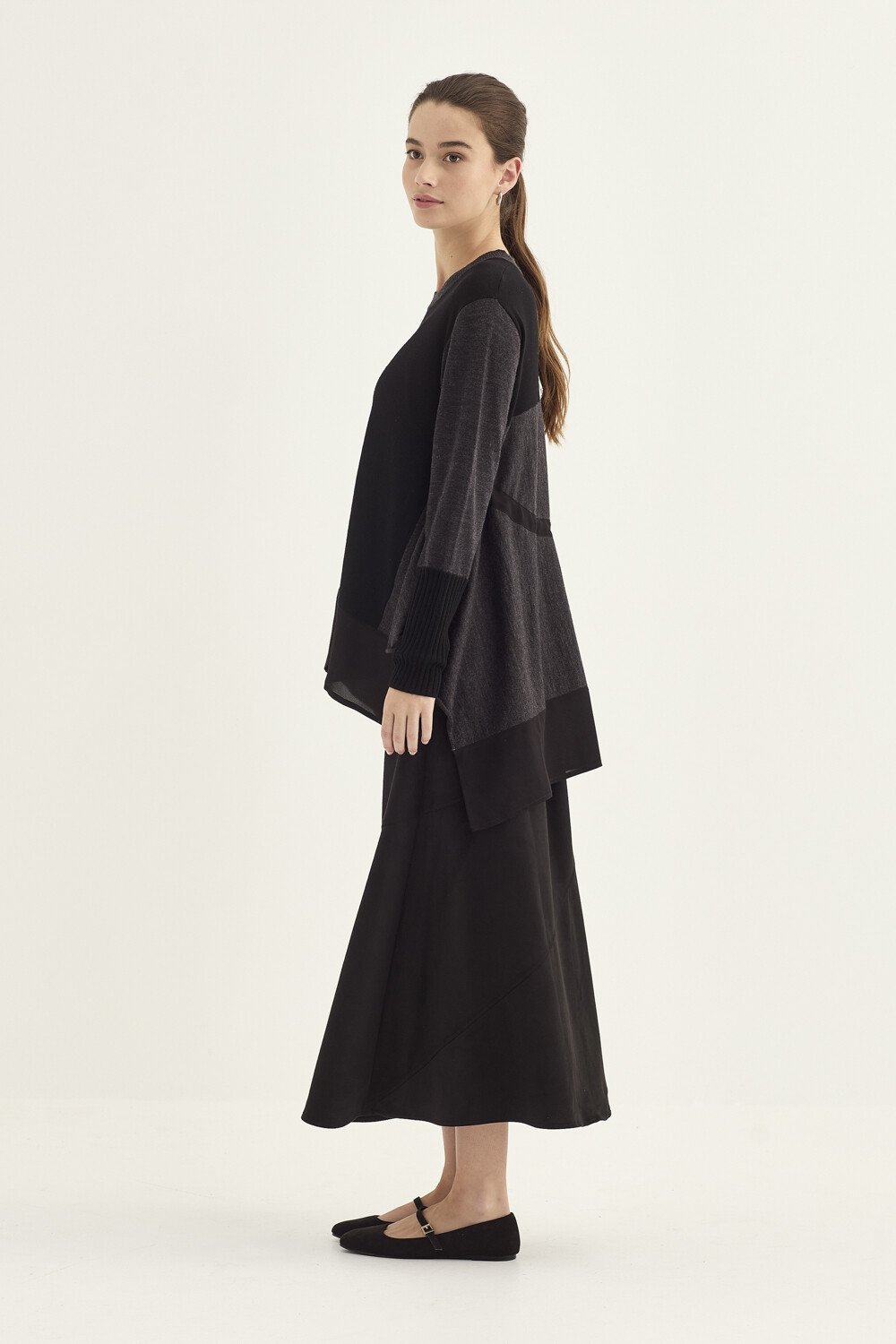 A striking asymmetrical hem, finished with contrast fabric, brings movement and a sculptural edge to the silhouette. The curved side panel adds subtle shaping while keeping the fit relaxed. Falling to mid-thigh, the Interactive Sweater is the perfect throw-on piece for pairing with slim pants, soft drape trousers, or denim.