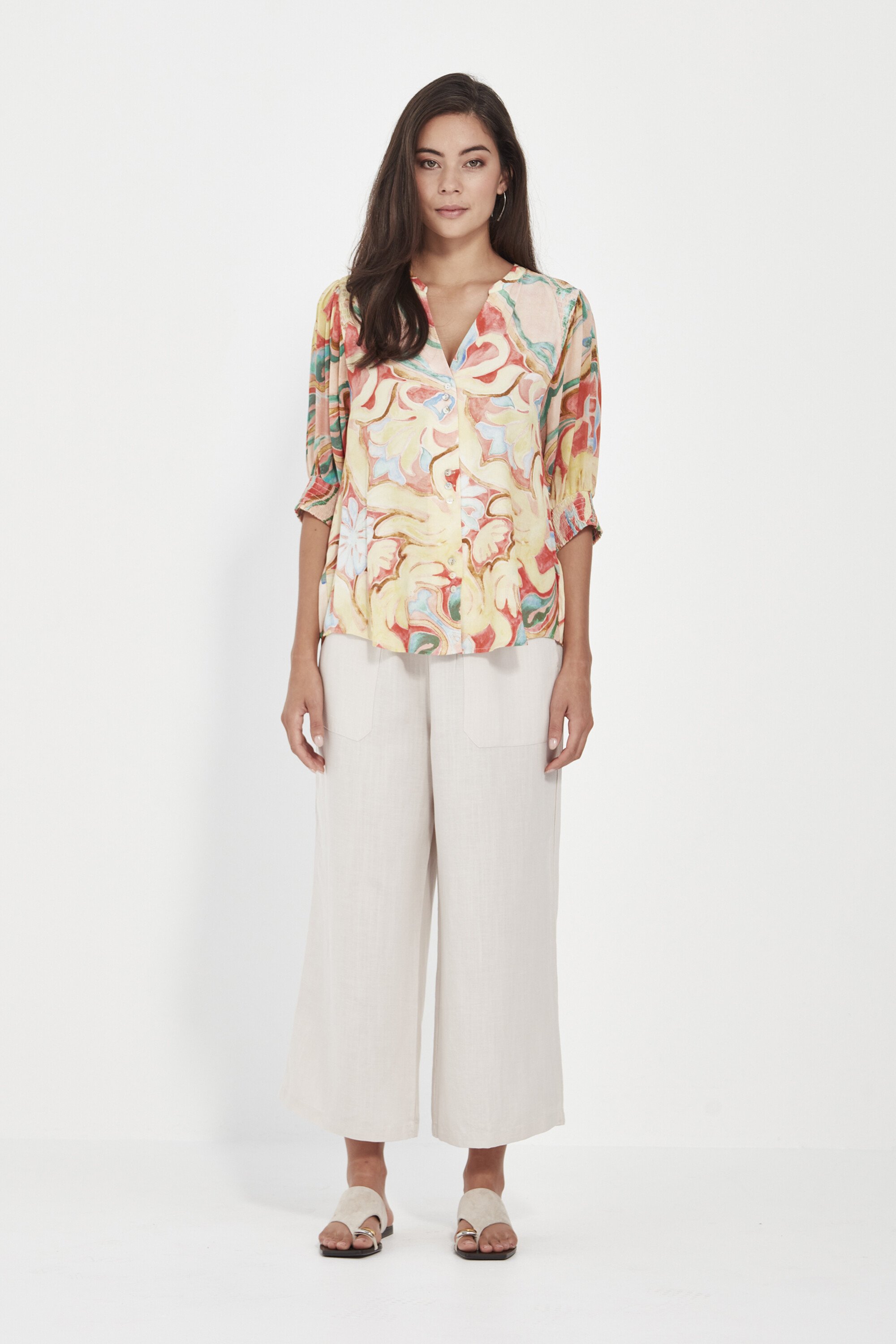 Light and effortless, the Rosalie Blouse is crafted in breezy viscose rayon for soft movement and breathability. Delicate shirred panels at the shoulders add subtle texture and shape, while the full sleeves gather into wide shirred cuffs for a romantic, blouson finish. The V neckline opens into a button-through front for versatile styling—wear it loose, tucked, or layered. Soft gathers at the back create gentle volume through the body, allowing the blouse to drape beautifully and skim the silhouette. A refined take on relaxed dressing, equally at home with tailored pants or casual denim. 53% Viscose 47% Rayon