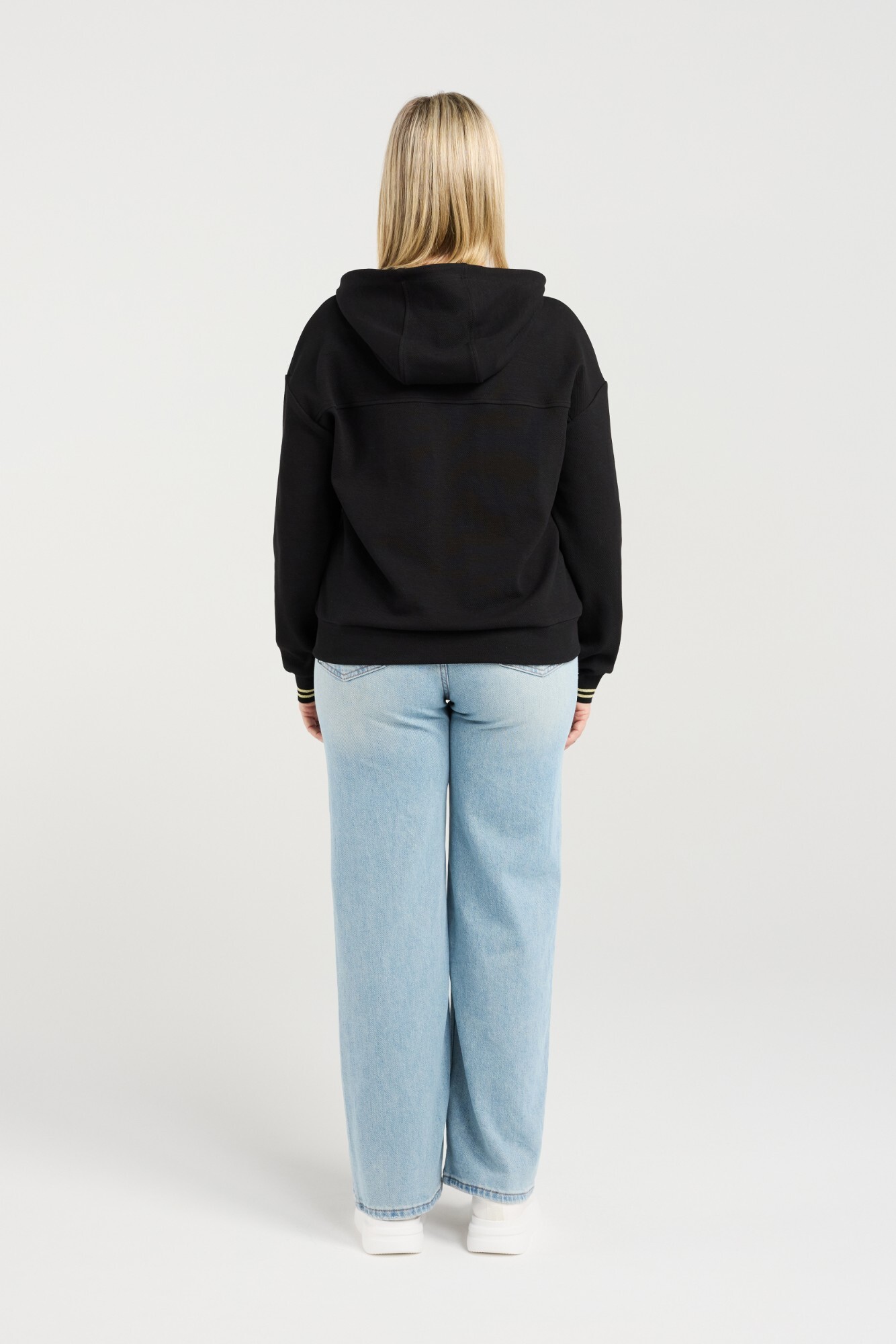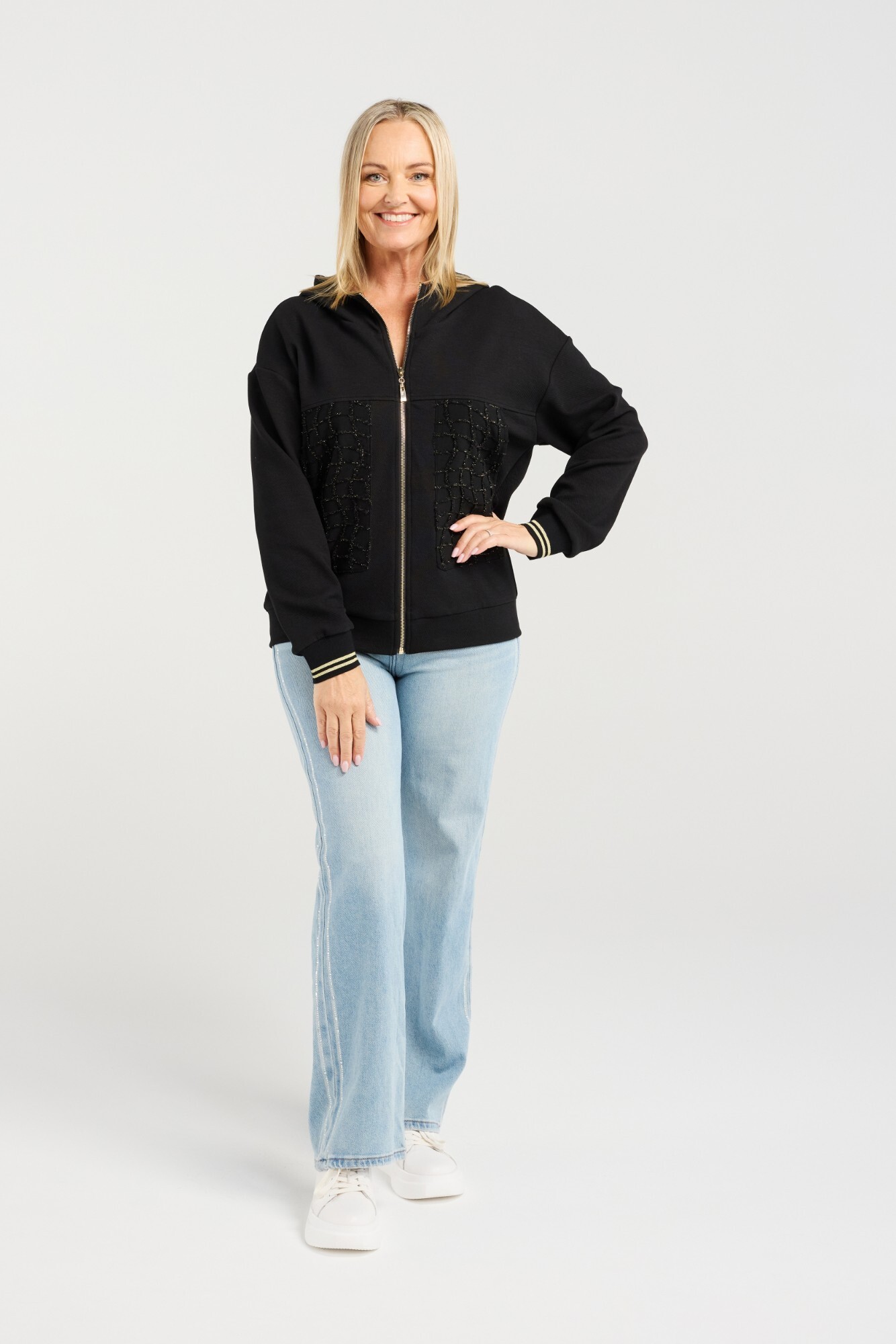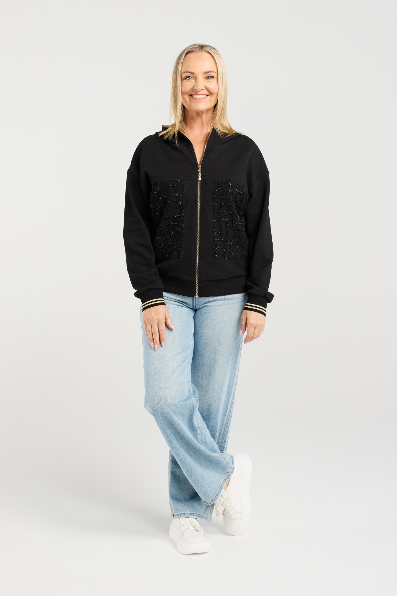 This black hoodie features contrasting panels in beautifully textured fabric with subtle gold details for a refined, modern look. Finished with a gold zipper and gold-trimmed cuffs, it brings effortless style and warmth to your winter wardrobe. A standout, elevated casual piece for the season.
